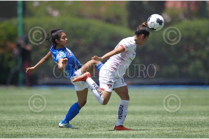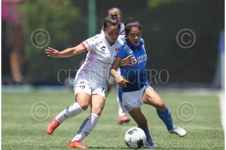 Vanessa González de Atlas y Diana García de Cruz Azul disputan un balón durante el partido de fútbol correspondiente a la jornada 13 del torneo Clausura 2022 “Grita por la paz” de la Liga MX Femenil entre Cruz Azul vs Atlas en el Centro de Alto Rendimiento La Noria.