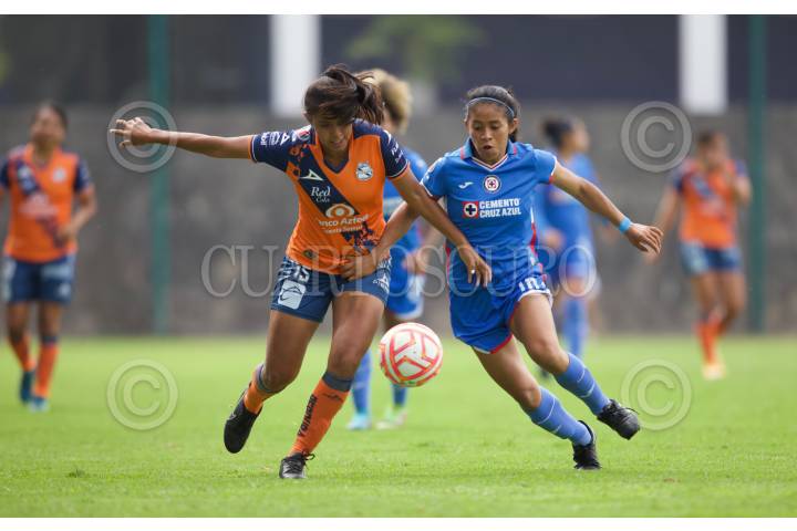 Jacqueline González de Puebla y Diana García de Cruz Azul disputan una pelota durante el partido de fútbol Cruz Azul vs Puebla correspondiente a la jornada 10 del Torneo Apertura 2022 de Liga BBVA MX Femenil, en instalaciones de La Noria.