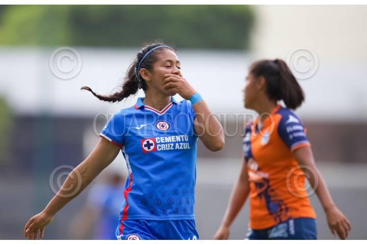 Diana García se lamenta durante el partido de fútbol Cruz Azul vs Puebla correspondiente a la jornada 10 del Torneo Apertura 2022 de Liga BBVA MX Femenil, en instalaciones de La Noria.