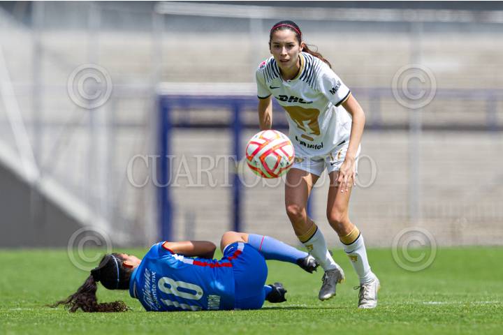 Diana García de Cruz Azul es derribada por Diana Gómez de Pumas durante el partido de fútbol Pumas vs Cruz Azul correspondiente a la jornada 11 del Torneo Apertura 2022 de Liga BBVA MX Femenil, en el estadio Olímpico Universitario.