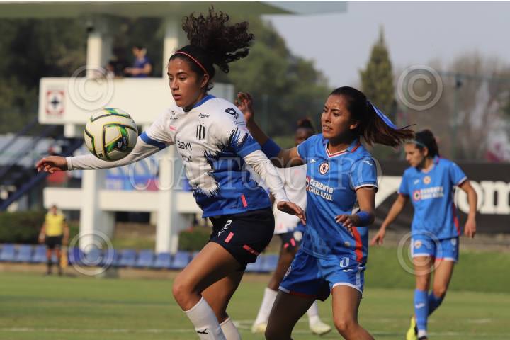 Diana García de Monterrey y Edith Carmona de Cruz Azul disputan una pelota durante el partido de fútbol Cruz Azul vs Monterrey correspondiente a la jornada 6 del Torneo Clausura 2023 de Liga BBVA MX Femenil, en instalaciones de La Noria.