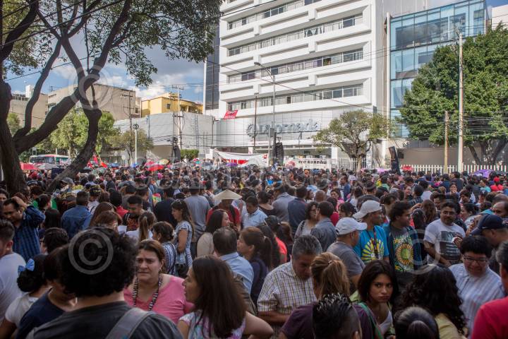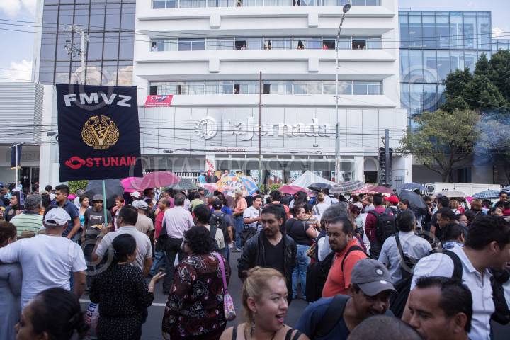 CIUDAD DE MÉXICO, 24AGOSTO2017.- Decenas de integrantes de diferentes sindicatos nacionales y extranjeros, se manifestaron en las instalaciones del diario La Jornada, en solidaridad a los trabajadores del Sitrajor, y en apoyo a Judith Calderón, secretaría general y líder del Sitrajor, que fue despedida hace unos días y enfrenta una demanda penal en su contra, al igual que su hijo Alejandro Caballero Calderón, joven de 20 años quien se había solidarizado con la lucha de su madre y los trabajadores del medio. FOTO: TERCERO DÍAZ /CUATOSCURO.COM