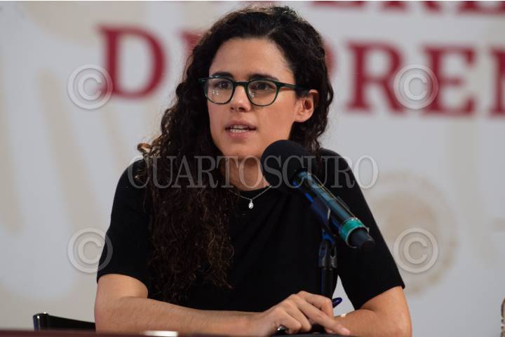 Luisa María Alcalde Luján, secretaria del Trabajo y Previsión Social durante la conferencia de prensa-informe diario sobre los créditos que otorga el gobierno.