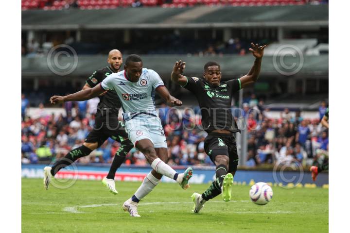Diber Cambindo, delantero del Cruz Azul, remata el balón en el área chica, frente a Félix Torres, defensa del Santos, durante el partido correspondiente a la jornada 4 del Torneo Apertura 2023.