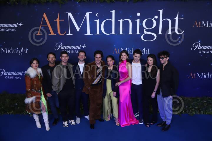 Parte del elenco a su paso por la alfombra azul por la premier de la cinta At Midnight de la plataforma Paramount+, en el Centro Cultural Roberto Cantoral.