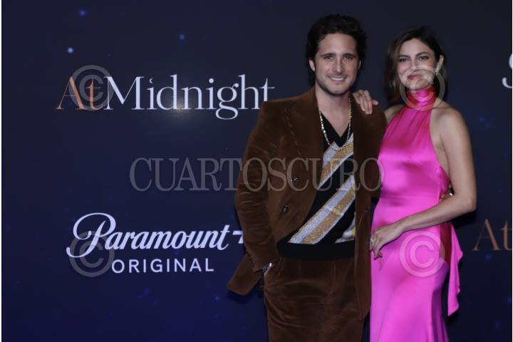 Los protagonistas Diego Boneta y Mónica Barbaro a su paso por la alfombra azul por la premier de la cinta At Midnight de la plataforma Paramount+, en el Centro Cultural Roberto Cantoral.