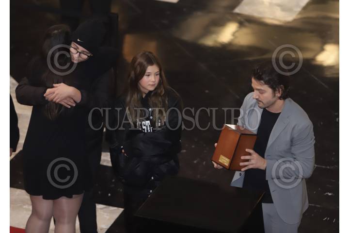 Diego Luna es consolado por sus hijos Jerónimo y Fiona durante el homenaje póstumo a su padre, el arquitecto y escenógrafo Alejandro Luna en el Palacio de Bellas Artes.