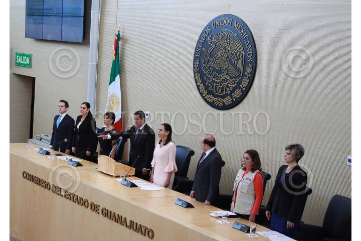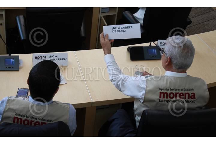 GUANAJUATO, GUANAJUATO, 26SEPTIEMBRE2018.- Durante la toma de protesta de Diego Sinhue Rodríguez Vallejo, como gobernador constitucional del Estado de Guanajuato ante el Pleno del Congreso local, diputados del partido Morena, se manifestaron en contra de Alvar Cabeza de Vaca Apendinni, actual Secretario de Seguridad Pública del Estado. FOTO: GUSTAVO BECERRA /CUARTOSCURO.COM