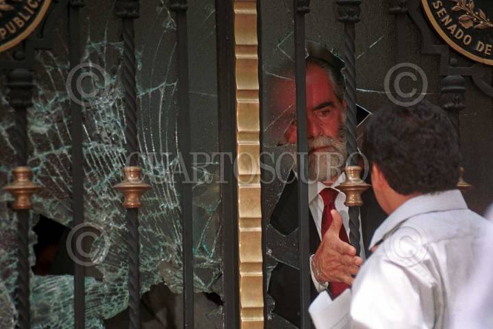 Un grupo de maestros arremetierón contra la puerta principal y camaras de seguridad , después un grupo de senadores entre ellos Diego Fenández de Cevallos presidente de la Mesa Directiva recibierón a una comisión. El Senado se comprometio como mediador ante el gobierno federal. FOTO: Pedro Mera/CUARTOSCURO.COM