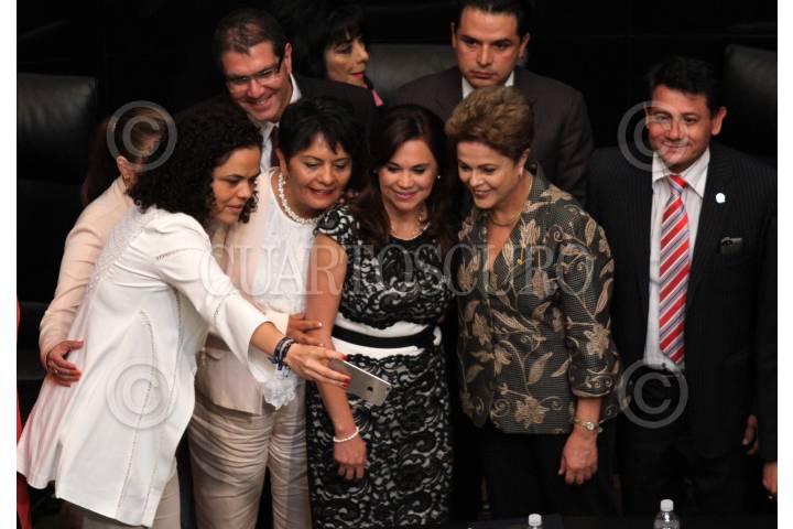 MÉXICO, D.F., 27MAYO2015.- Dilma Rousseff, presidenta de la República Federativa de Brasil, durante su visita a la sesión solemne por su visita de estado en el Senado de la República. En la imagen, senadoras se toman una selfie con la presidenta brasileña. FOTO: ADOLFO VLADIMIR /CUARTOSCURO.COM