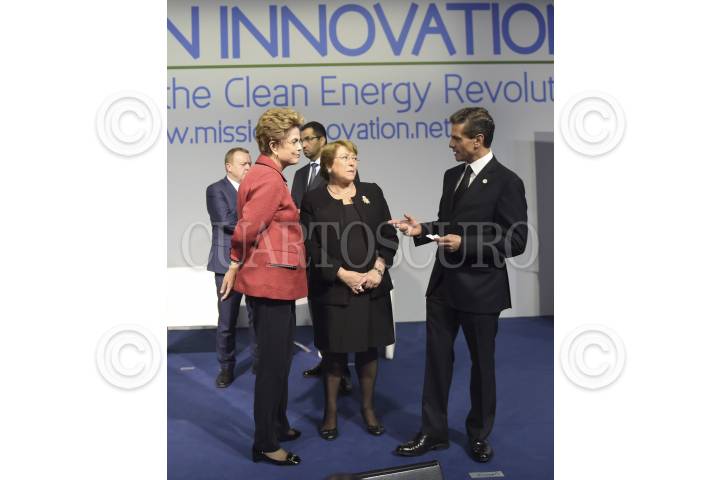PARÍS, FRANCIA, 30NOVIEMBRE2015.- Antes de partir de regreso a México, el Presidente Enrique Peña Nieto participó en el panel de la Iniciativa “Mission Innovation”, que se desarrolló en el marco de los trabajos de la COP21. La iniciativa tiene como objetivo acelerar la inversión pública y privada en energías verdes, y fue presidida por el Mandatario francés, Francois Hollande, junto con su homólogo estadunidense, Barack Obama, y el empresario activista Bill Gates. En la imagen el mandatario mexicano conversa con las presidentas Dilma Rousseff, Brasil y Michelle Bachelet, Chile. FOTO: PRESIDENCIA /CUARTOSCURO.COM