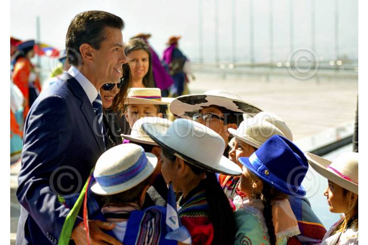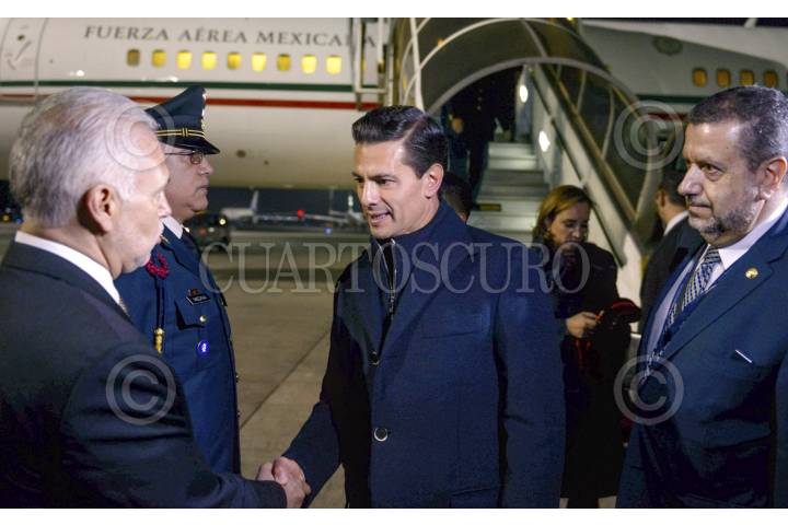 QUITO, ECUADOR, 27ENERO2016.- El Presidente Enrique Peña Nieto fue recibido por José Serrano Salgado, Ministro de Seguridad de la República del Ecuador; el Embajador Fabián Valdivieso, Director de la Comisión de Protocolo; y Jaime Manuel del Arenal, Embajador de México en Ecuador, a su llegada a esta capital, en donde participará en la Cuarta Cumbre de Jefes de Estado y de Gobierno de la Comunidad de Estados Latinoamericanos y del Caribe (CELAC). FOTO: PRESIDENCIA /CUARTOSCURO.COM