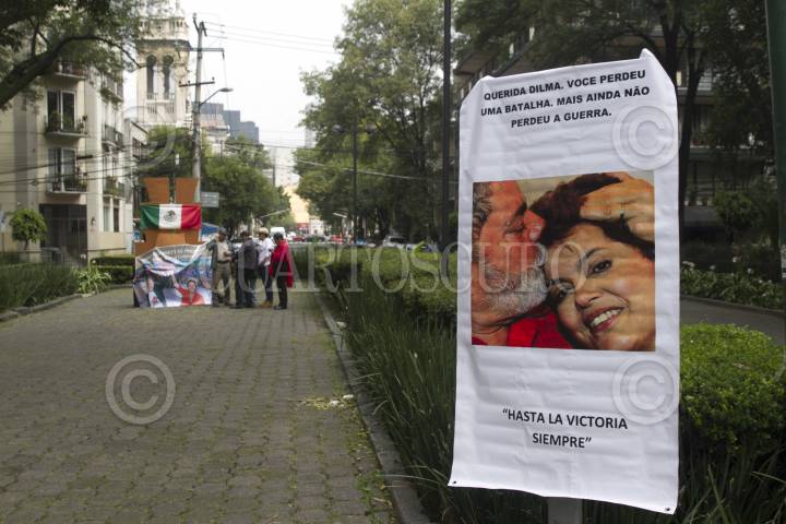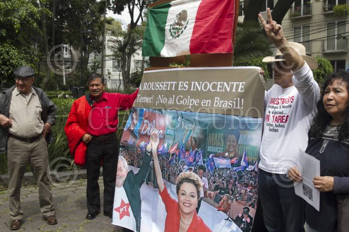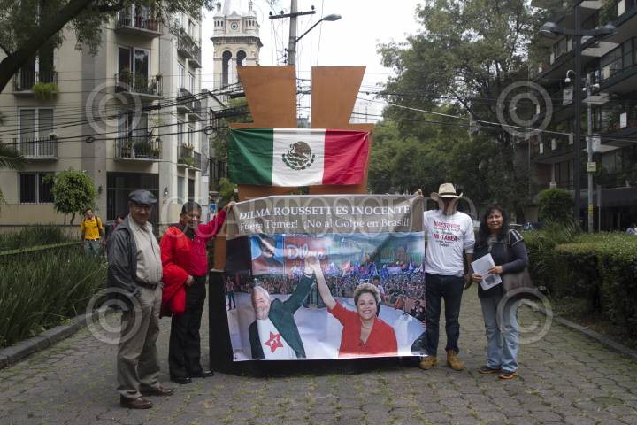 CIUDAD DE MÉXICO, 28AGOSTO2016.- Un grupo de ciudadanos mostraron su apoyo a la presidenta destituida de Brasil, Dilma Rousseff, quien enfrenta en su país un juicio para validar su salida del poder, realizando un mitin en Plaza Río de Janeiro. Los convocantes tildan el proceso judicial de viciado y alevoso, demás de atacarla por su condición de mujer. FOTO: MOISÉS PABLO /CUARTOSCURO.COM
