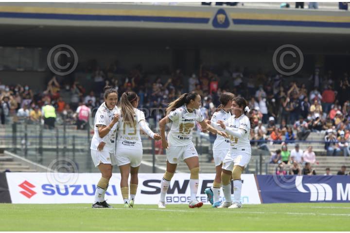 Dinora Garza de Pumas festeja junto a sus compañeras durante el partido de fútbol Pumas vs Mazatlán correspondiente a la jornada 1 del Torneo Apertura 2022 de Liga BBVA MX Femenil, en el estadio Olímpico Universitario.