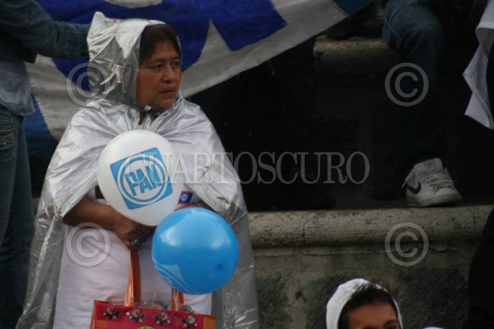 OAXACA, OAXACA, 30MARZO2012.- Militantes y simpatizantes del Partido Acción Nacional (PAN) soportaron una tenue lluvia que cayo de improviso en la Verde Antequera, durante el mitin de campaña de Diodoro Carrasco, quien contiende por el PAN para ocupar un lugar en el Senado. FOTO: ARTURO PÉREZ ALFONSO /CUARTOSCURO.COM