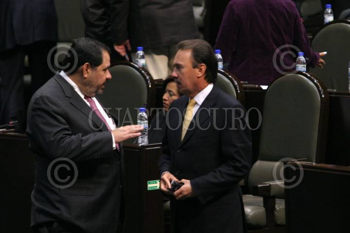 MEXICO, D.F. 23NOVIEMBRE2006.- Héctor Larios, coordinador de la fracción parlamentaria del PAN y Emilio Gamboa Patrón, coodinador de la fracción parlamentaria del PRI conversan durante durante la sesión ordinaria en la cámara de diputados. FOTO: NELLY SALAS/CUARTOSCURO.COM