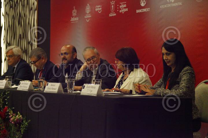 GUADALAJARA, JALISCO. 02SEPTIEMBRE2024.- Izq.-Der, Carlos Reis Catedrático en la Universidad de Coímbra (Portugal) y miembro del Jurado del Premio FIL de Literatura en Lenguas Romances, Héctor Raúl Solís Vicerrector Ejecutivo de la UdeG., Ricardo Villanueva Rector General de la Universidad de Guadalajara, Marisol Schulz Manaut Directora General de la FIL, Enrique Ibarra Secretario General de Gobierno y Dulce María Zúñiga Coordinadora Académica de la UdeG., encabezaron la conferencia de prensa donde dieron a conocer como ganador del Premio FIL de Literatura en Lenguas Romances al escritor Mozambiqueño Mia Couto. FOTO: FERNANDO CARRANZA GARCIA / CUARTOSCURO.COM