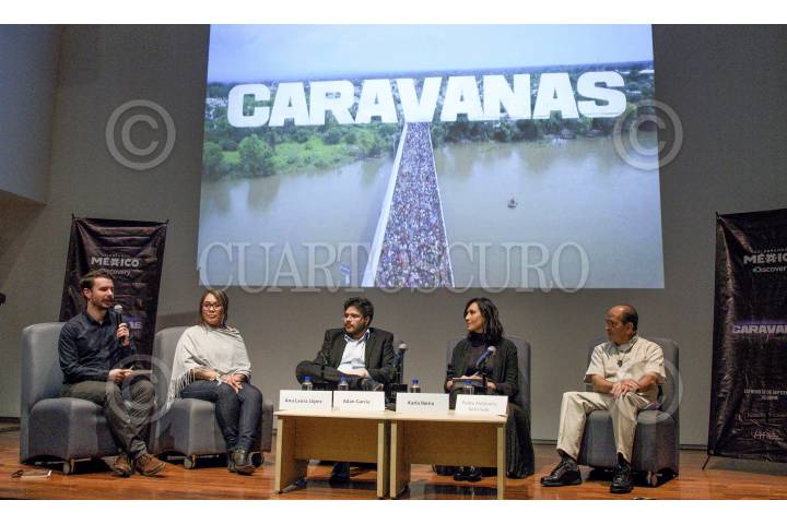 CIUDAD DE MÉXICO, 10SEPTIEMBRE2019.- Carlos Cubero; Ana Laura López; Adán García; Karla Iberia Sánchez y el Padre Alejandro Solalinde, encabezaron en el auditorio del Museo Memoria y Tolerancia la presentación oficial de la producción de Discovery “Caravanas” la cual documenta el movimiento migratorio masivo que comenzó el año pasado. El programa se estrenará el próximo 18 de septiembre por el canal de televisión Discovery. FOTO: MARIO JASSO /CUARTOSCURO.COM