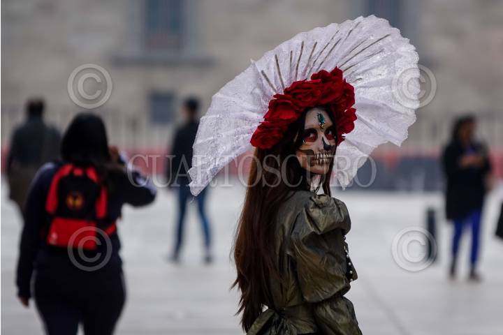 CIUDAD DE MÉXICO, 24OCTUBRE2024.- Una joven catrina posa sobre las calles del Centro Histórico de la Ciudad de México. Los próximos 1 y 2 de noviembre se celebran las festividades por Día de Muertos, una de las tradiciones más importantes para la cultura mexicana. FOTO: GALO CAÑAS/CUARTOSCURO.COM