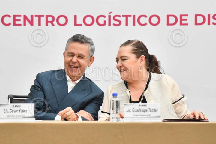 TEPOTZOTLÁN, ESTADO DE MÉXICO, 30ABRIL2025.- César Yáñez, subsecretario de Gobernación, y Guadalupe Taddei, consejera presidenta del Instituto Nacional Electoral (INE), durante el banderazo de salida para la distribución de las millones de boletas electorales y material de casillas para los comicios del próximo 1 de junio, en donde elegirían ministros, magistrados y jueces del Poder Judicial. FOTO: MARIO JASSO/CUARTOSCURO.COM