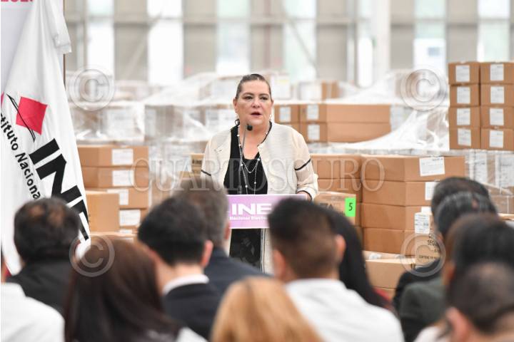 TEPOTZOTLÁN, ESTADO DE MÉXICO, 30ABRIL2025.- Guadalupe Taddei, consejera presidenta del Instituto Nacional Electoral (INE), durante el banderazo de salida para la distribución de las millones de boletas electorales y material de casillas para los comicios del próximo 1 de junio, en donde elegirían ministros, magistrados y jueces del Poder Judicial. FOTO: MARIO JASSO/CUARTOSCURO.COM