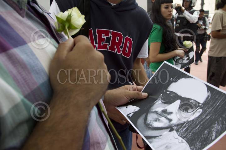 GUADALAJARA, JALISCO. 2AGOSTO2015.-.Esta mañana periodistas Jaliscienses protestaron para exigir justicia por el homicidio del colaborador de la Agencia Cuartoscuro, Rubén Espinosa, quien fue asesinado el pasado viernes en el Distrito Federal, en donde se refugió ante las amenazas del gobierno priísta de Javier Duarte. Los periodistas señalaron que es alarmante la situación que se vive en el país, ya que el cobarde asesinato de Espinosa quien se encontraba con 4 mujeres, quienes también fueron privadas de la vida, es un claro mensaje; "no hay sitio en México para esconderse de las amenazas de los gobiernos estatales". FOTO: RUBÉN ESPINOSA/ CUARTOSCURO.COM