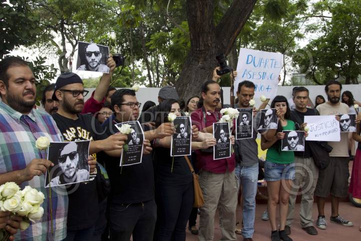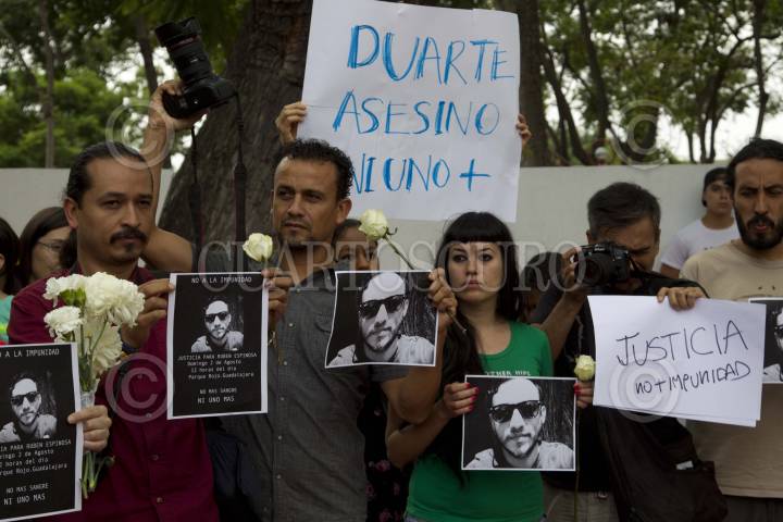 GUADALAJARA, JALISCO. 2AGOSTO2015.-.Esta mañana periodistas Jaliscienses protestaron para exigir justicia por el homicidio del colaborador de la Agencia Cuartoscuro, Rubén Espinosa, quien fue asesinado el pasado viernes en el Distrito Federal, en donde se refugió ante las amenazas del gobierno priísta de Javier Duarte. Los periodistas señalaron que es alarmante la situación que se vive en el país, ya que el cobarde asesinato de Espinosa quien se encontraba con 4 mujeres, quienes también fueron privadas de la vida, es un claro mensaje; "no hay sitio en México para esconderse de las amenazas de los gobiernos estatales". FOTO: RUBÉN ESPINOSA / CUARTOSCURO.COM