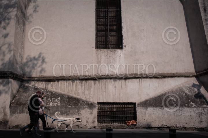 Una pareja pasea a su perro por las calles del Centro de la Ciudad