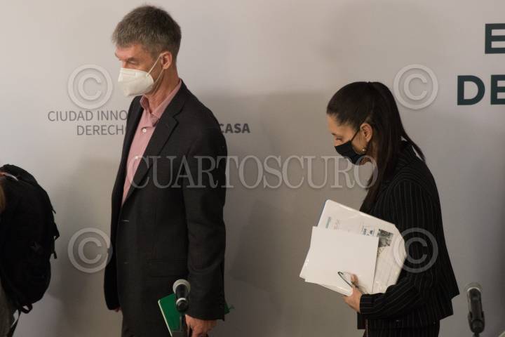Claudia Sheinbaum Pardo, Jefa de Gobierno, recibió el informe de la fase 1 de los peritajes realizados en la zona del accidente de la Línea 12, el cual fue realizado por la empresa DNV México. La mandataria pasa a lado de Eckhard Hinrichsen, director general DNV México.