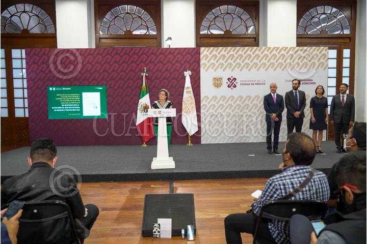 Jesús Esteva, secretario de Obras; Claudia Sheinbaum, Jefa de Gobierno, y Myriam Urzúa Venegas, secretari de Gestión Integral de Riesgos y Protección Civil de la Ciudad de México, muestra el informe sobre los peritajes del accidente de la Línea 12, realizado por la empresa DNV.