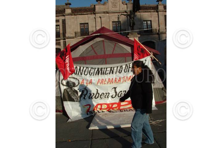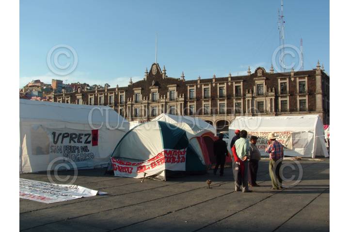 TOLUCA, ESTADO DE MEXICO, 08DICIEMBRE2008.- Doce campamentos fueron instalados frente al palacio de gobierno estatal y el Congreso del Estado de México por representantes de la Unión Popular Revolucionaria Emiliano Zapata (UPREZ) de 60 municipios como Ecatepec, Naucalpan, Tultitlán, Nezahualcóyotl, Los Reyes, San Vicente Chicoloapan, Ixtapaluca, Amecameca, Valle de Chalco, Atlautla, Chimalhuacán y Tejupilco, para exigir que el gobernador del estado, Enrique Peña Nieto, y los legisladores mexiquenses se reduzcan el sueldo a un 50 por ciento, mayor apoyo en becas a personas con alguna discapacidad, madres solteras y a los jóvenes; así como incrementar el presupuesto a la salud pública, educación y al campo. Los uprecistas aseguran que no se retirarán hasta que haya una respuesta a sus demandas. FOTO: MARIO NULO/CUARTOSCURO.COM