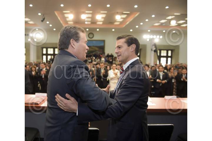 Ciudad de México, 15 de mayo de 2016.- El Presidente Enrique Peña Nieto encabezó hoy en la Residencia Oficial de Los Pinos la celebración del Día del Maestro, acto en el que entregó la Condecoración “Maestro Altamirano” a profesores con destacada actuación docente, así como a maestros que obtuvieron altos niveles en la evaluación de desempeño. En la imagen el presidente saluda a Juan Díaz de la Torre, dirigente del Sindicato Nacional de Trabajadores de la Educación. FOTO: PRESIDENCIA /CUARTOSCURO.COM