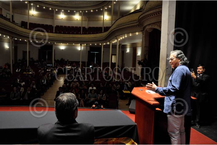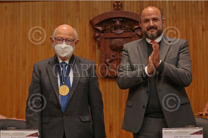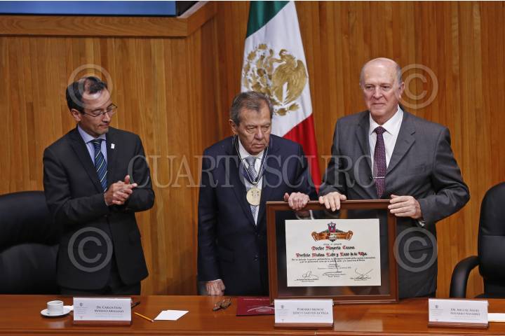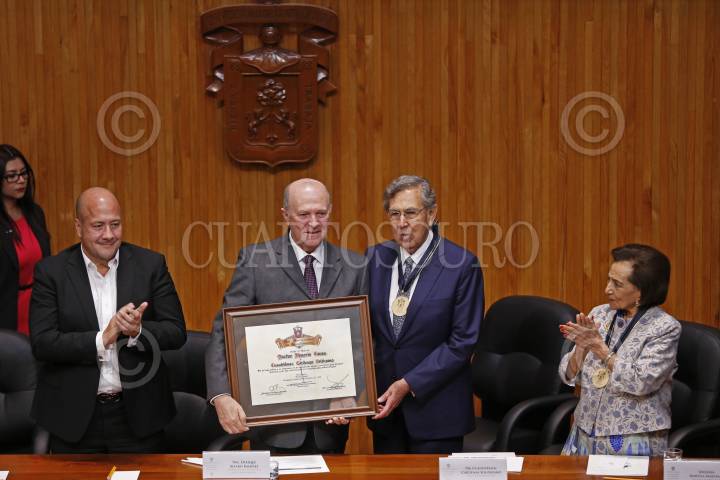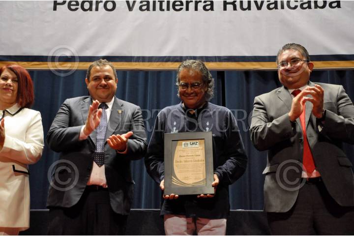 ZACATECAS, ZACATECAS, 12SEPTIEMBRE2019.- El fotoperiodista Pedro Valtierra Ruvalcaba fue galardonado con la máxima distinción que otorga la Universidad Autónoma de Zacatecas el Doctorado Honoris Causa, el cual es concedido a personajes distinguidos por su trayectoria profesional. En esta ocasión la distinción recayó en el fresnillense por su destacada trayectoria internacional, como fotoperiodista, artista de la lente y corresponsal en numerosos conflictos bélicos en América Latina y África. El Doctorado Honoris Causa reconoce la trayectoria de Valtierra que lo ha hecho merecedor de innumerables reconocimientos entre otros el premio Rey de España a la mejor fotografía noticiosa internacional en 1998; y en 2016 la Medalla al Mérito en Artes en la categoría de artes visuales que otorga la Asamblea Legislativa de la Ciudad de México. En su currículum hay más de 350 exposiciones en México y diversos países como Rusia, Argentina, Estados Unidos, Inglaterra, Canadá, Cuba, España, Francia, Italia, Alemania, Bélgica, Venezuela, Ecuador, Guatemala y Costa Rica; así como innumerables concursos nacionales e internacionales de los que ha sido jurado. Entregaron el reconocimiento el rector de la UAZ, Antonio Guzmán Fernández, y el secretario general de la UAZ, Ruben de Jesús Ibarra. FOTO: CARLOS SEGURA /CUARTOSCURO.COM