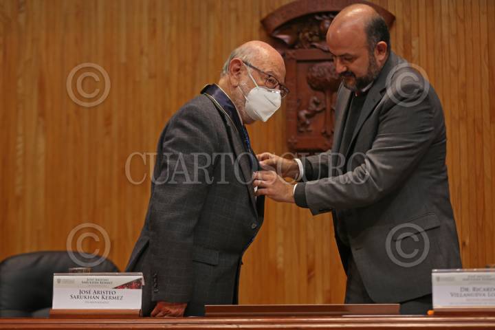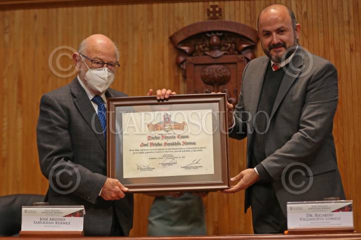 Ricardo Villanueva hace entrega del Doctorado Honoris Causa al científico y académico mexicano José Aristeo Sarukhán Kermez, esto en la edición 36 de la Feria Internacional del Libro de Guadalajara (FIL).