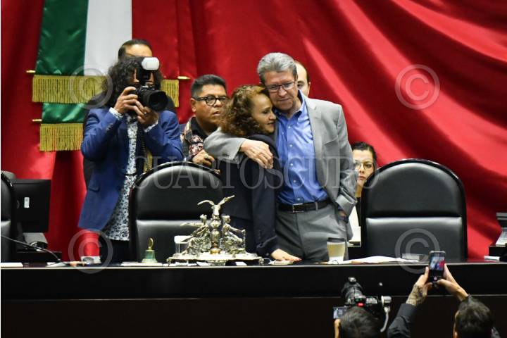 CIUDAD DE MÉXICO, 10ABRIL2025.- Ricardo Monreal, diputado y coordinador de Morena, abraza a Dolores Padierna, presidenta de la mesa directiva, durante la sesión ordinaria semipresencial de la Cámara de Diputados en la que se discute el plan nacional de desarrollo 2025-2030. FOTO: MARIO JASSO/CUARTOSCURO.COM