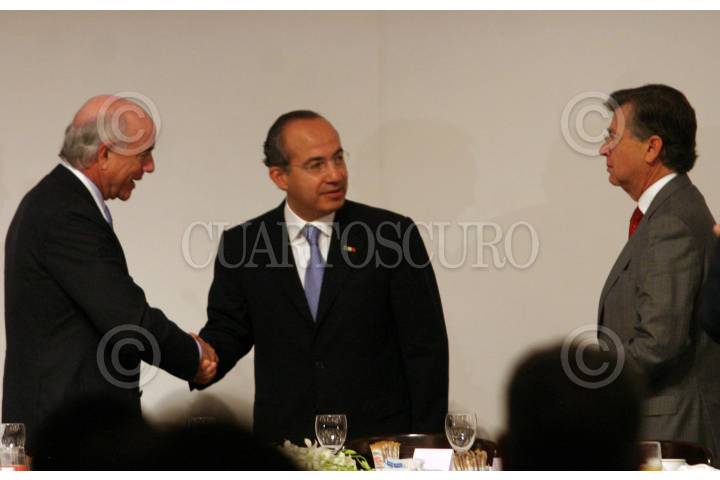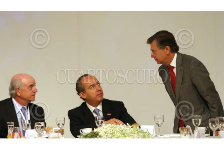 MÉXICO, D.F., 29JUNIO2007.- Felipe González, director general de BBVA España, Felipe Calderón Hinojosa, Presidente de la República y Hector Rángel Domene, Presidente del Consejo de Administración de Bancomer BBVA, durante su desayuno con motivo del 75 aniversario de la institución bancaria ne un hotel de Polanco. FOTO: MOISÉS PABLO/CUARTOSCURO.COM
