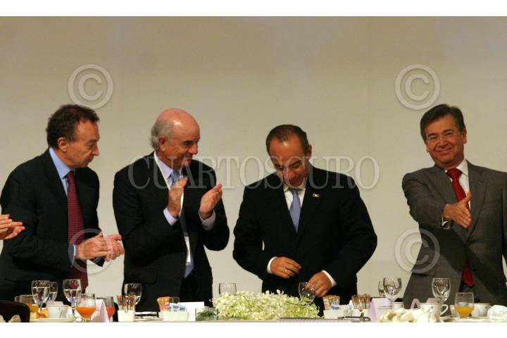 MÉXICO, D.F., 29JUNIO2007.- Guillermo Ortiz, gobernador del Banco de México, Felipe González, director general de BBVA Bancomer España, Felipe Calderón Hinojosa, Presidente de la República y Hector Rángel Domene, Presidente del Consejo de Administración de Bancomer BBVA, durante su desayuno con motivo del 75 aniversario de la institución bancaria ne un hotel de Polanco. FOTO: MOISÉS PABLO/CUARTOSCURO.COM
