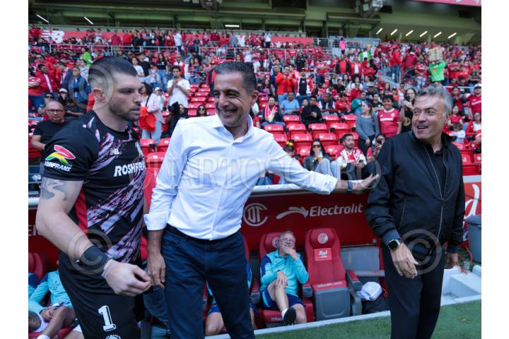 TOLUCA, ESTADO DE MÉXICO, 25AGOSTO2024.- El portero Tiago Volpi y Renato Paiva DT de los Diablos de Toluca saludan a Domenec Torrent DT de la escuadra del Atlético de San Luis en el partido correspondiente a la jornada 5 del Tornero Apertura 2024 de la LIGA MX, el encuentro tuvo un marcador final 2-1. FOTO: CRISANTA ESPINOSA AGUILAR /CUARTOSCURO.COM