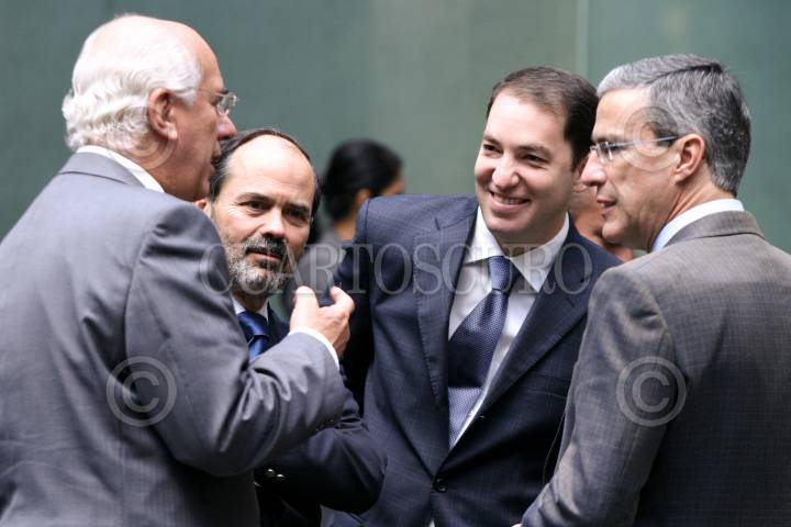 MÉXICO D.F., 22OCTUBRE2008.- Los senadores Dante Delgado, Carlos Navarrete, Jorge Legorreta y José González Morfin conversan antes del inicio de la toma de protesta del presidente del comité directivo del Instituto Belisario Domingez que se realizo en el patio central del Senado de la República. FOTO: RODOLFO ANGULO/CUARTOSCURO.COM