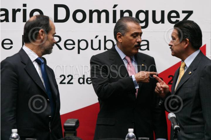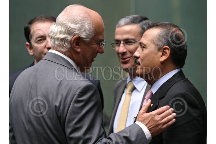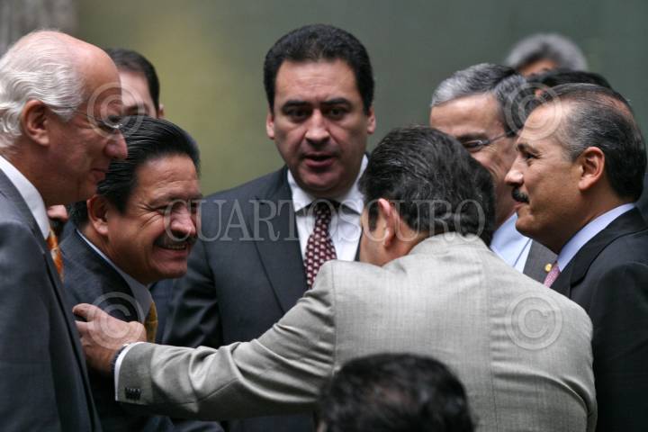 MÉXICO D.F., 22OCTUBRE2008.- Los senadores Dante Delgado, Carlos Navarrete, Humberto Aguilar y Manlio Fabio Beltrones conversan antes del inicio de la toma de protesta del presidente del comité directivo del Instituto Belisario Domingez que se realizo en el patio central del Senado de la República. FOTO: RODOLFO ANGULO/CUARTOSCURO.COM