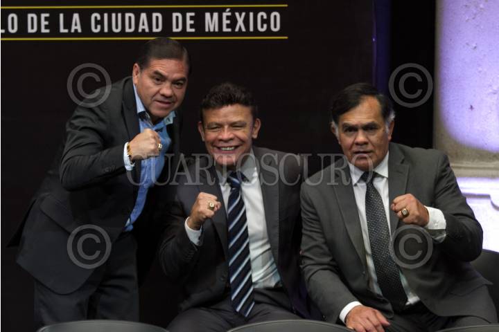 CIUDAD DE MÉXICO, 30MARZO2017.- Las leyendas del boxeo nacional Humberto "La Chiquita" González, Daniel Zaragoza, y José Luis "Pipino" Cuevas, durante la la presentación de los boxeadores que participarán en la magna de función de boxeo, que se realizará el próximo 1 de abril en la plancha del Zócalo. FOTO: MOISÉS PABLO /CUARTOSCURO.COM