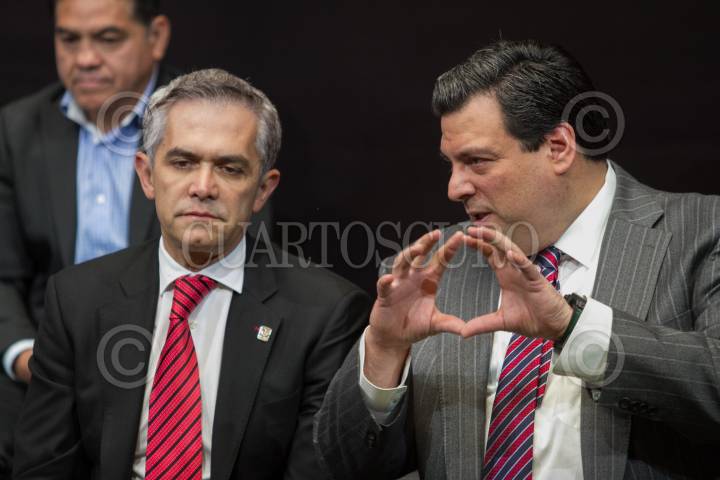 CIUDAD DE MÉXICO, 30MARZO2017.- Miguel Ángel Mancera, Jefe de Gobierno, y Mauricio Sulaimán, presidente de Consejo Mundial de Box (CMB), conversan en la presentación de los boxeadores que participarán en la magna de función de boxeo, que se realizará el próximo 1 de abril en la plancha del Zócalo. FOTO: MOISÉS PABLO /CUARTOSCURO.COM