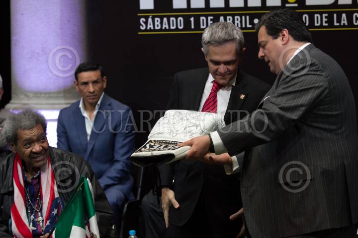CIUDAD DE MÉXICO, 30MARZO2017.- Miguel Ángel Mancera, Jefe de Gobierno, recibió un guante de box con la firma de todos los ex campeones que asistieron a la presentación de los peleadores que participarán en la magna de función de boxeo, que se realizará el próximo 1 de abril en la plancha del Zócalo. FOTO: MOISÉS PABLO /CUARTOSCURO.COM