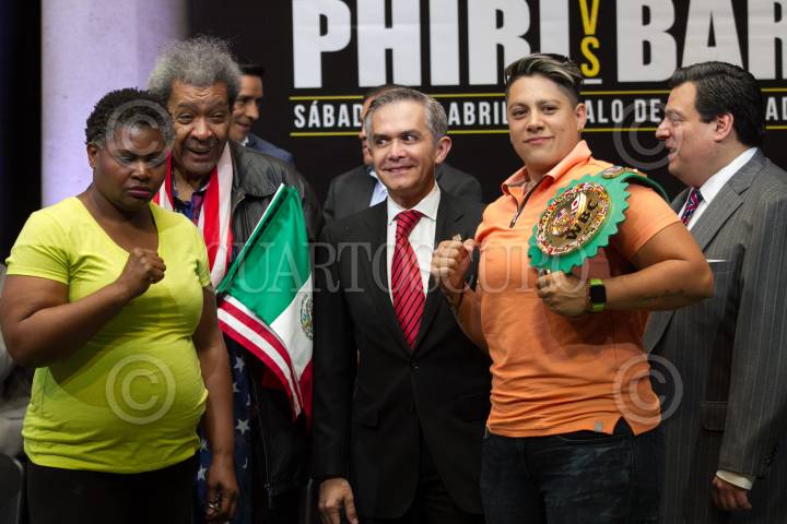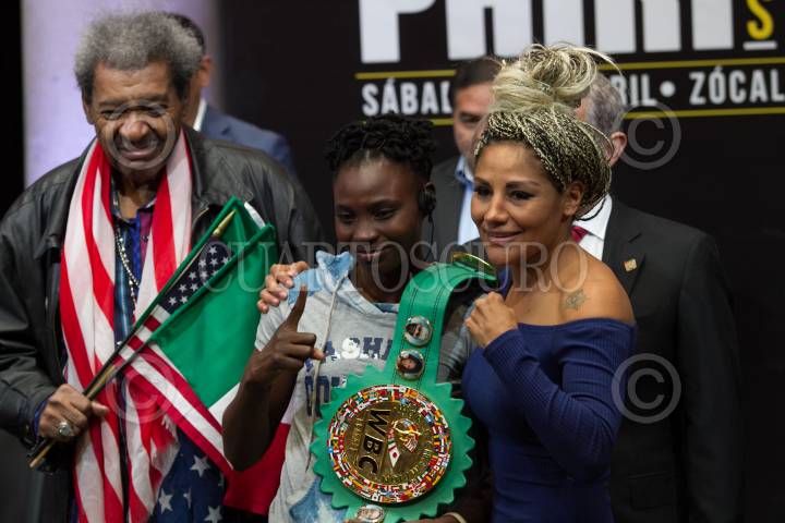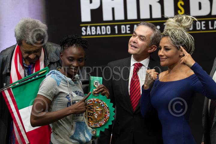 CIUDAD DE MÉXICO, 30MARZO2017.- El promotor de Box Don King y Miguel Ángel Mancera, Jefe de Gobierno, presentaron a los peleadores que participarán en la magna de función de boxeo, que se realizará el próximo 1 de abril en la plancha del Zócalo. En la imagen la estadounidense Carlette Ewe y Alejandra “Tigre” Jiménez, quienes disputarán el cinturo de peso completo del Consejo Mundial de Box, propiedad de la capitalina. FOTO: MOISÉS PABLO /CUARTOSCURO.COM