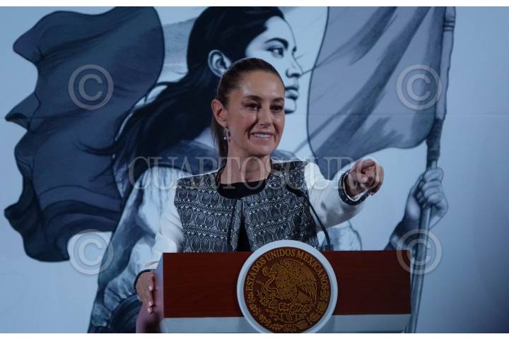 CIUDAD DE MÉXICO, 03ABRIL2025.- Claudia Sheinbaum Pardo, presidenta de México, encabezó la conferencia "Mañanera del Pueblo" en la que dió detalles sobre el "trato preferenial" debido al T-MEC al que quedó sujeto el comercio bilateral con la administración de Donald Trump, tras las amenazas de la imposición de aranceles de 25% FOTO: GALO CAÑAS/CUARTOSCURO.COM