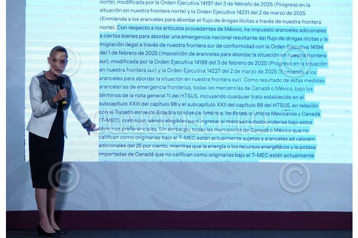 CIUDAD DE MÉXICO, 03ABRIL2025.- Claudia Sheinbaum Pardo, presidenta de México, explica la publicación de la Casa Blanca respecto los acuerdos sobre el "trato preferenial" debido al T-MEC al que quedó sujeto el comercio bilateral con la administración de Donald Trump, tras las amenazas de la imposición de aranceles de 25%. FOTO: GALO CAÑAS/CUARTOSCURO.COM