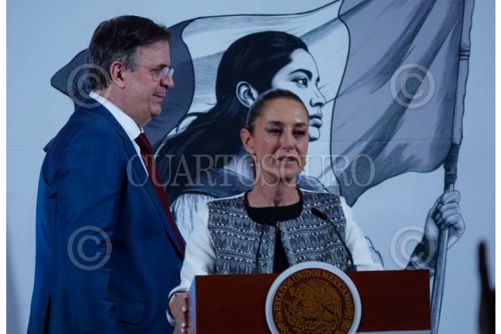 CIUDAD DE MÉXICO, 03ABRIL2025.- Marcelo Ebrard, secretario de Economía, y Claudia Sheinbaum, presidenta de México, durante la conferencia "Mañanera del Pueblo" en la que explicó los detalles sobre el "trato preferenial" debido al T-MEC al que quedó sujeto el comercio bilateral con la administración de Donald Trump, tras las amenazas de la imposición de aranceles de 25% FOTO: GALO CAÑAS/CUARTOSCURO.COM
