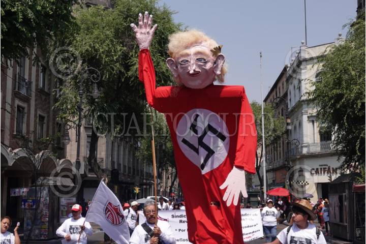 CIUDAD DE MÉXICO, 01MAYO2025.- En el marco Día Internacional del Día del Trabajo, integrantes de diversos sindicatos marcharon para exigir sus derechos en laborales en un protesta que inicio en Avenida Juárez y termino en el Zócalo capitalino. En la imagen, una botarga de Donald Trump, presidente de los Estados Unidos de América, vestido con un traje con el símbolo nazi. FOTO: GRACIELA LÓPEZ/CUARTOSCURO.COM