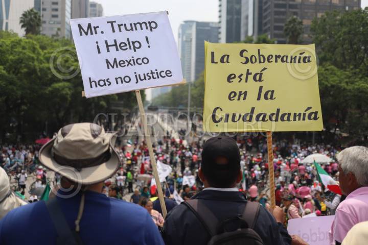 CIUDAD DE MÉXICO 01JUNIO2025.- Asistentes de la marcha "Yo No Voto" llevaron un cartel en inglés pidiéndole ayuda al presidente de Estados Unidos, Donald Trump, cientos de personas se dieron cita en el Ángel de la Independencia para mostrar su rechazo a las elecciones del Poder Judicial. FOTO: DANIEL AUGUSTO/ CUARTOSCURO.COM