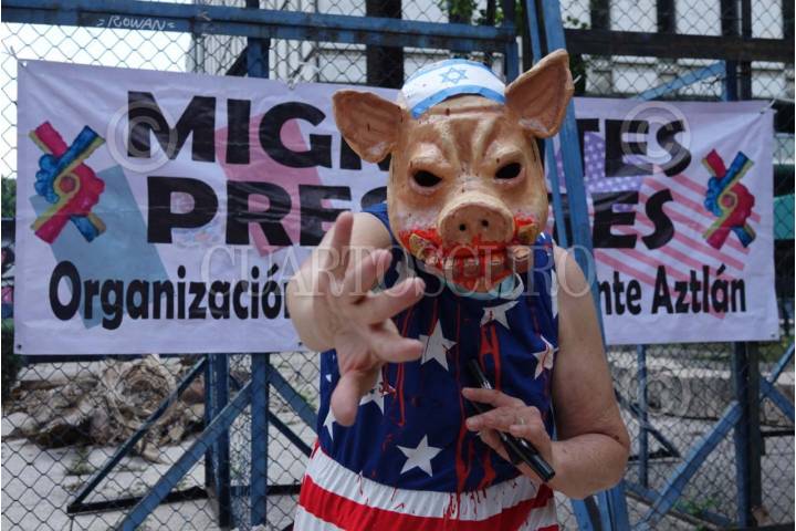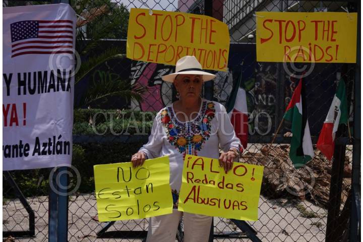 CIUDAD DE MÉXICO, 09JUNIO2025.- Una activista protestó afuera de la Embajada Americana para exigir justicia por los migrantes detenidos por orden de Donald Trump, presidente de los Estados Unidos de América, en redadas en Los Ángeles, en donde ayer elementos de la Guardia Nacional reprimió un grupo de personas en movilización frente al Centro de Detención Metropolitano de Los Ángeles. FOTO: GRACIELA LÓPEZ/CUARTOSCURO.COM